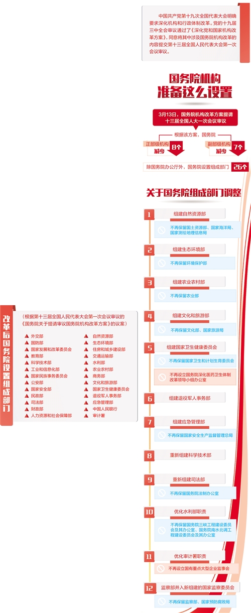不久前闭幕的党的十九届三中全会审议通过了《中共中央关于深化党和国家机构改革的决定》和《深化党和国家机构改革方案》,同意把《深化党和国家机构改革方案》的部分内容按照法定程序提交十三届全国人大一次会议审议。国务院机构改革方案正是根据上述精神形成的。