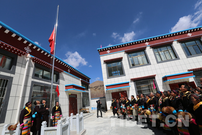 在村委会广场上,彩旗飘扬,人声鼎沸,全村1000余名农牧民群众身着节日的盛装,唱着感恩的歌曲,跳起幸福的果谐(藏族的一种歌舞形式,流行于农牧区)。再定睛一看,全村家家户户的屋顶都插上了崭新的五星红旗,鲜艳的五星红旗迎风招展。