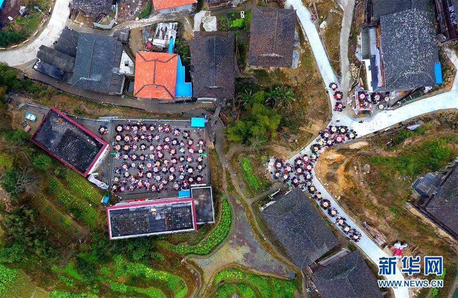 在广西融水苗族自治县杆洞乡党鸠村,村民们拿出自家的小板凳参加百家宴(1月17日摄)。