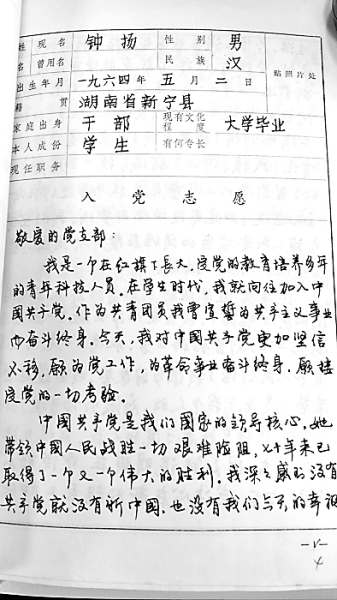 “我是一个在红旗下长大,受党的教育培养多年的青年科技人员。在学生时代,我就向往加入中国共产党。作为共青团员,我曾宣誓为共产主义事业而奋斗终身。今天,我对中国共产党更加坚信不移,愿为党工作,为革命事业奋斗终身,愿接受党的一切考验。”1990年4月26日,26岁的钟扬在入党志愿书中郑重写道。字迹俊朗,一丝不苟。