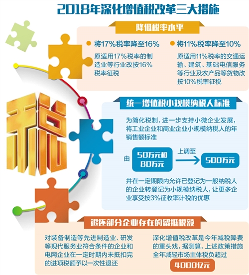 3月30日,在国务院新闻办公室举行的国务院政策例行吹风会上,财政部有关负责人介绍,深化增值税改革将是今年减税降费的重头戏,此次三项深化增值税改革措施全年为企业减负4000亿元。