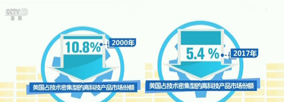 同时,美国商品在中国市场竞争力不足也是一个重要原因。数据显示,中国进口中有三分之一是技术密集型的高科技产品。和2000年相比,美国占这一类商品的市场份额已经从10.8%降到了去年的5.4%。