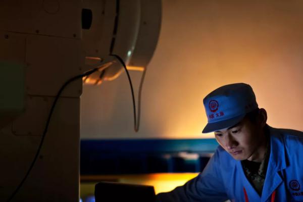 2011年11月8日,一名技术人员在太原卫星发射中心某光学点号光学设备前全神贯注地工作。新华社记者 刘彬 摄
