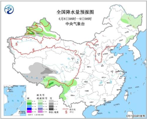 4月8日08时至9日08时,新疆北部高海拔地区、黑龙江东北部、吉林东南部、青藏高原中南部、川西高原南部等地有小到中雪或雨夹雪;云南西北部、北疆低海拔地区、西藏东南部等地有小到中雨。内蒙古、黑龙江等地有4~6级风;新疆南疆盆地等地有扬沙或浮尘天气。巴士海峡、南海东北部偏南海域、南海中部海域将有8级、阵风9级大风,黄海东南部海域、东海东北部海域将有7级、阵风8级的西南风,南海西部海域将有7级、阵风8级的东北风。