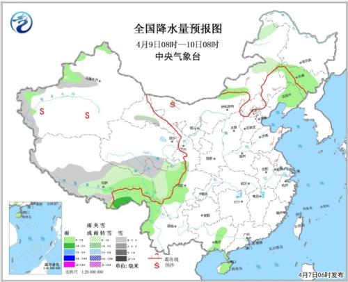 4月9日08时至10日08时,内蒙古东北部、吉林、辽宁、青藏高原中南部、川西高原等地的部分地区有小雪或雨夹雪;西藏东南部、云南西北部等地有小到中雨。内蒙古中西部等地有4~6级风,南疆盆地和内蒙古西部等地有扬沙或浮尘天气。
