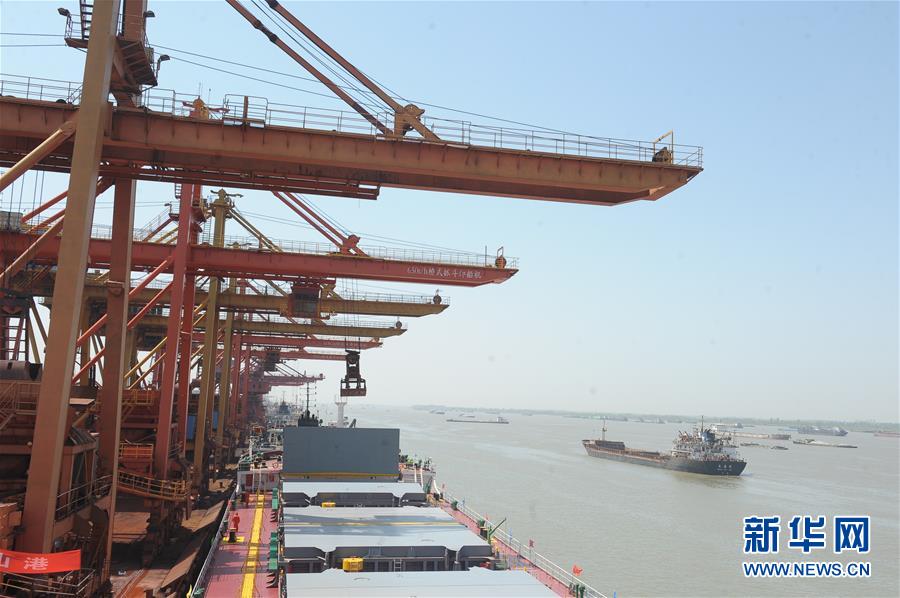 4月10日,“江海直达1”号停靠在安徽省马鞍山市马钢港务原料总厂码头,卸船机进行卸货作业。新华社发(吴琳红 摄)