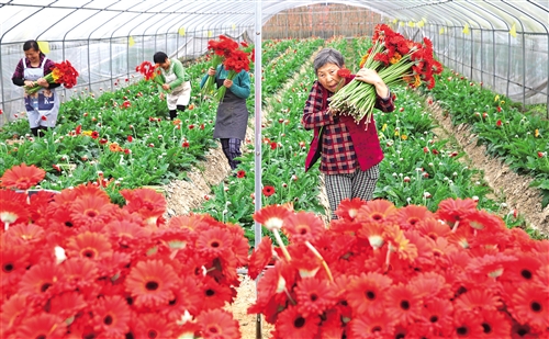 四川眉山市彭山区凤鸣镇村民在明都花卉基地帮业主采摘非洲菊。近年来,四川眉山市彭山区通过规范土地流转,调动有能力的业主流转土地发展花卉等产业,当地贫困村民在获得流转土地收益后还能在基地务工。 姚永亮摄