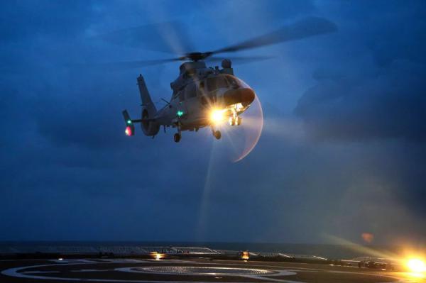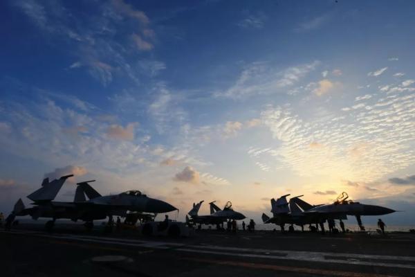 △4月20日,海军辽宁舰编队在西太平洋,开展远海作战对抗训练。图为晨曦中的舰载机静待起飞。