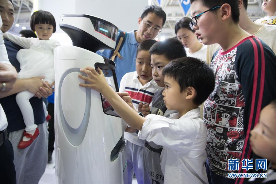 4月22日,在首届数字中国建设成果展览会上,孩子们被展出的机器人吸引。