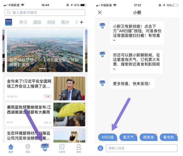 只要点击新华社客户端首页下方的“小新机器人”,使用“AR功能”扫描二代身份证带有国徽和长城图案的一面,就可以随时和新华社记者一起出发。