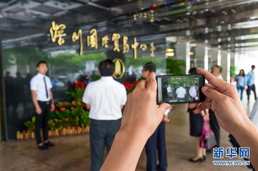 4月26日,贾金宣重回深圳国际贸易中心大厦时,一位讲解员在向游客介绍国贸大厦建设史,他拿起手机录下这段视频。新华社记者刘大伟摄