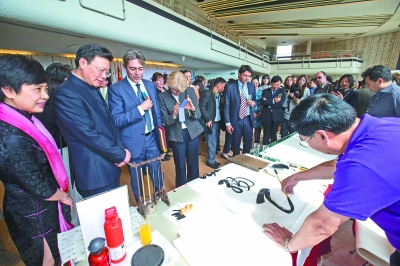 近日,在瑞士日内瓦联合国万国宫举行的中文日活动上,来宾观看书法家现场创作。 新华社发