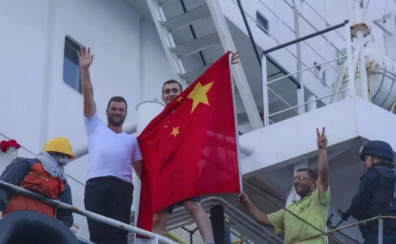 被解救的叙利亚籍船员身披五星红旗大喊:“Thank You China”。当时作为玉林舰的海军陆战队士兵宋玺热泪盈眶。