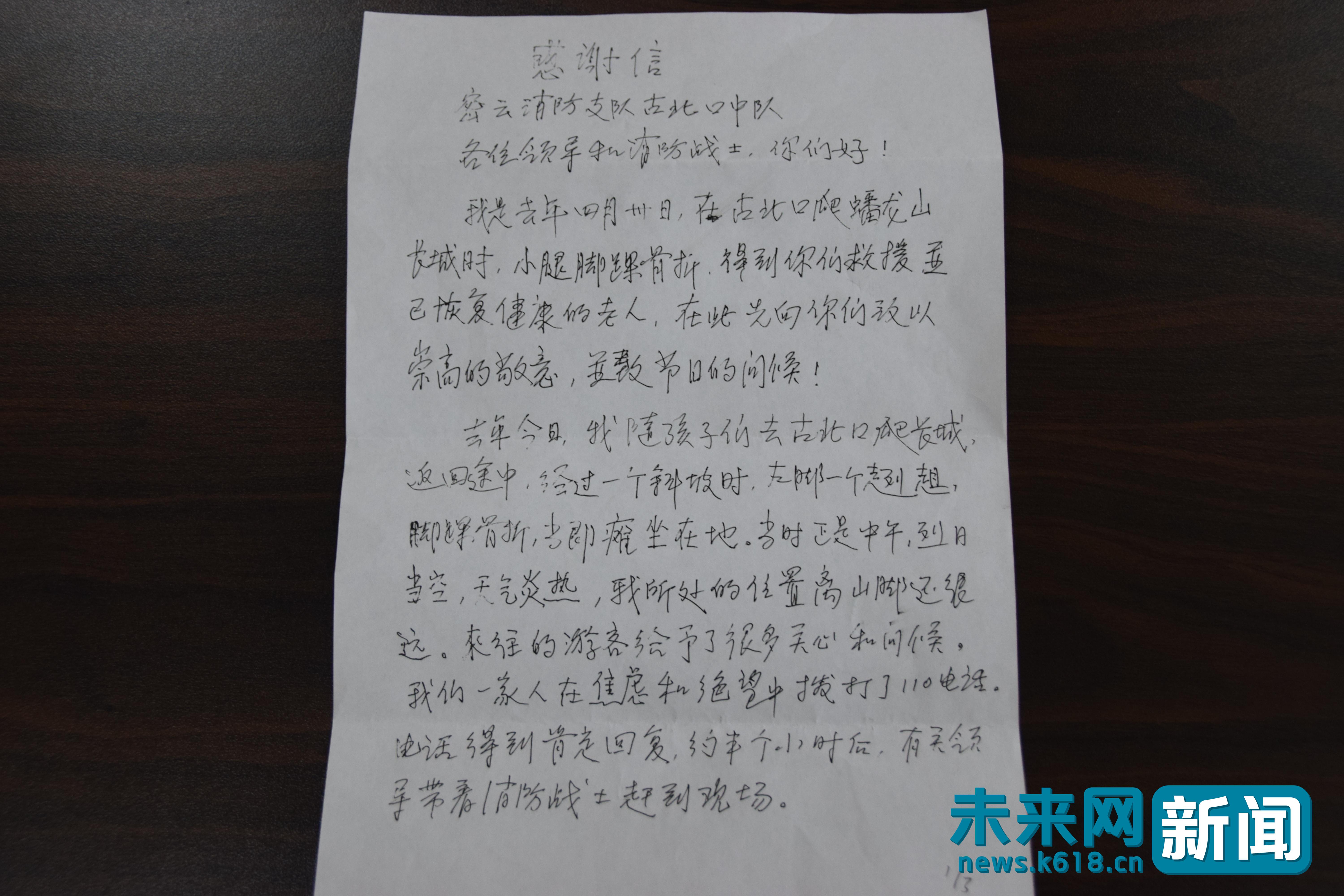 一年前,一位河北老人随子女爬古北口长城不慎摔伤。幸亏得到消防队员的救援,及时将其抬下山送往医院治疗。时隔一年老人康复,近日亲笔手写感谢信,字里行间充满了对消防员的真诚感激和无尽谢意。