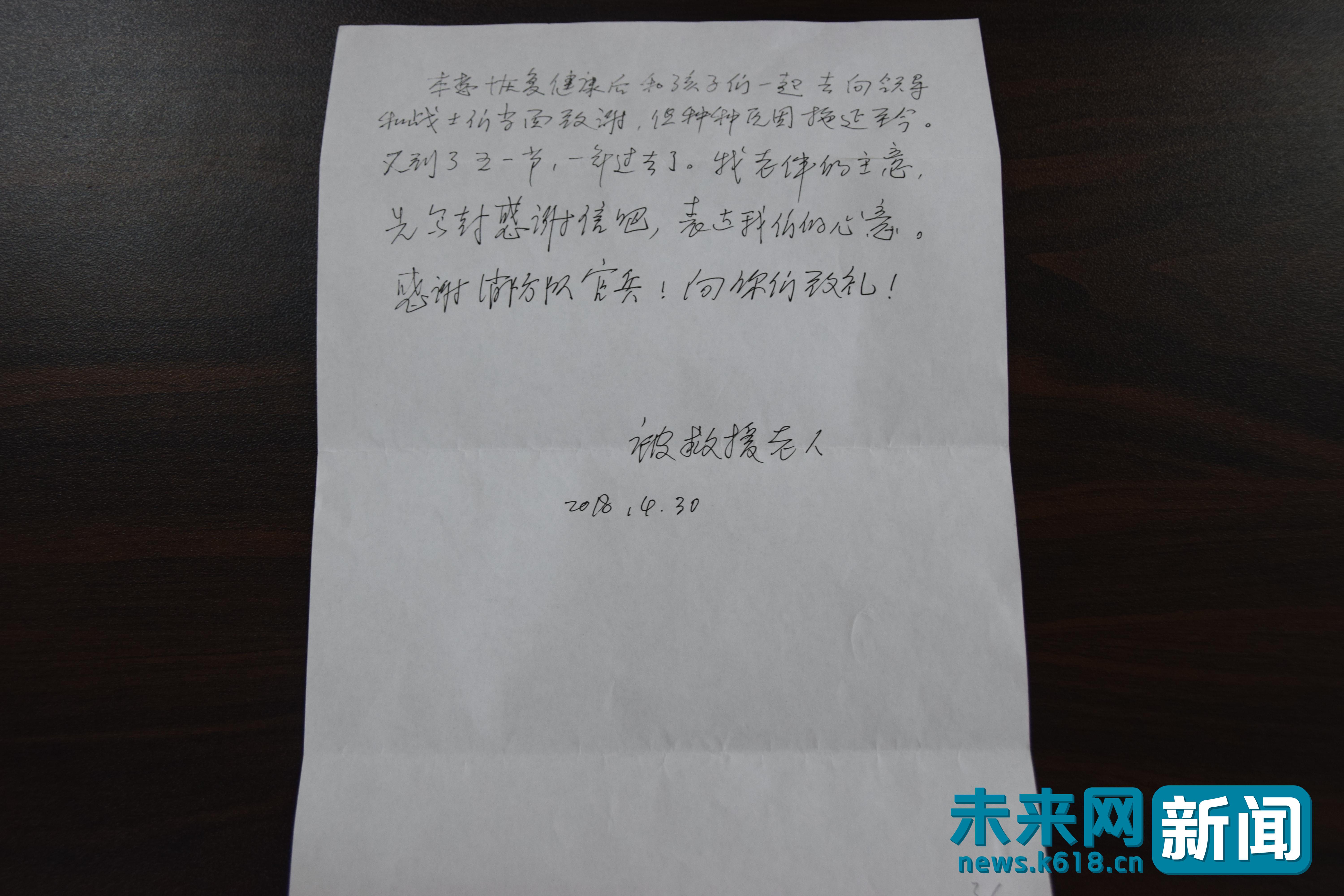 本意恢复健康后和孩子们一起去向领导和战士们当面致谢,但种种原因拖延至今。又到了五一节,一年过去了,我老伴的主意,写一封感谢信,表达我们的心意。感谢消防队官兵,向你们致礼!”