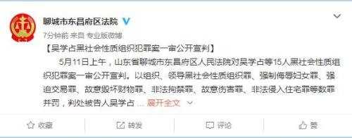 据山东省聊城市东昌府区人民法院官方微博消息,5月11日上午,山东省聊城市东昌府区人民法院对吴学占等15人黑社会性质组织犯罪案一审公开宣判。以组织、领导黑社会性质组织罪、强制侮辱妇女罪、强迫交易罪、故意毁坏财物罪、非法拘禁罪、故意伤害罪、非法侵入住宅罪等数罪并罚,判处被告人吴学占有期徒刑25年,并处没收个人全部财产;以参加黑社会性质组织罪等罪数罪并罚,分别判处被告人赵荣荣、李忠、郭树林、郭彦刚、吴风磊、林飞、吴洪艳、杜建岗、吴风志20年至2年8个月不等的有期徒刑,并处40万元至6万元不等的罚金。以非法拘禁罪分别判处被告人张博、严建军、程学贺、张书森、么传行2年2个月至2年不等的有期徒刑。