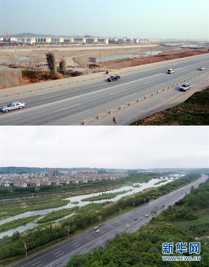 拼版照片上图:初具雏形的北川新县城一角(新华社记者范长国2010年2月2日摄);下图:北川新县城及辽宁大道(新华社记者江宏景2018年5月10日使用无人机拍摄)。新华社发