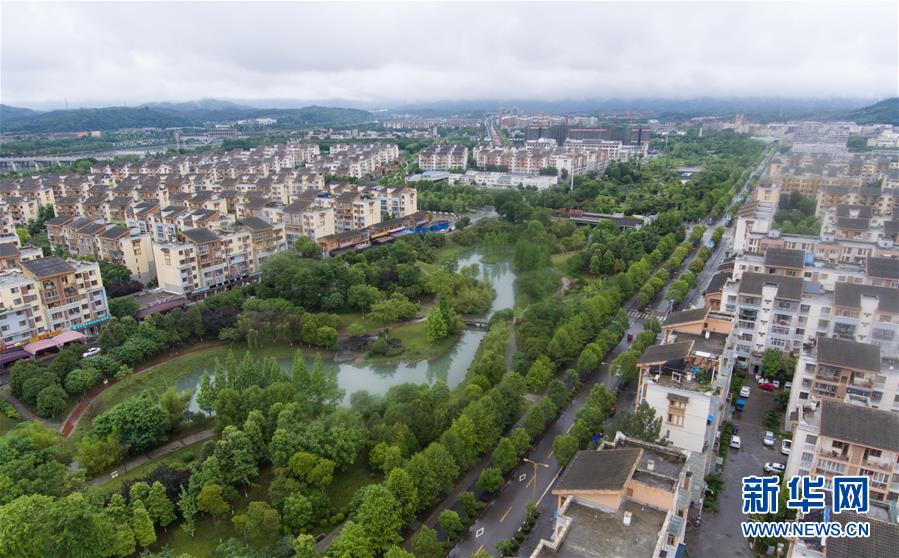 俯瞰北川新县城新川河景观带(5月10日无人机拍摄)。新华社记者江宏景 摄