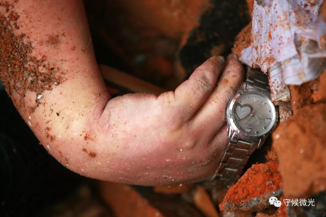 2008年5月16日,绵竹市汉旺镇东汽中学,一位在地震中遇难的女孩被抢险队员从坍塌的教学楼废墟里挖出,手上戴着的手表还依然“嘀-嗒-嘀-嗒”地走着。