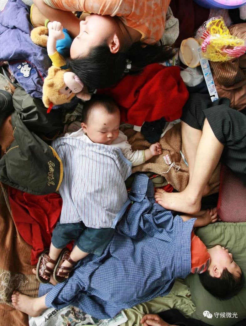 2008年5月17日,绵阳九洲体育馆,一位小朋友在人群中熟睡。从北川灾区救出的幸存者陆续在绵阳九洲体育馆聚集。