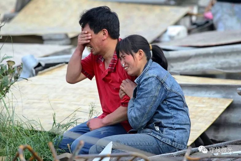 2008年5月15日,汶川县映秀镇,从乐山来到映秀做小生意的一对夫妇,守着9岁儿子的遗体嚎啕痛哭。