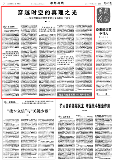 在纪念马克思诞辰200周年大会上,习主席强调:“两个世纪过去了,人类社会发生了巨大而深刻的变化,但马克思的名字依然在世界各地受到人们的尊敬,马克思的学说依然闪耀着耀眼的真理光芒!”马克思主义早已穿越了时空的界限,闪耀着永恒的真理光芒。请关注今天出版的《解放军报》的报道——
