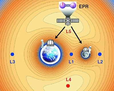 潘建伟团队提出了一个基于人类自由意志,在地球-月球之间开展贝尔不等式检验的实验方案(如上图所示)。由于人的反应时间在几百毫秒左右,为了让纠缠产生、基矢选择、探测测量等事件都满足类空间隔条件,用于选择测量基矢的实验者需要相距十万公里以上,远远大于地球直径。团队提出利用地球、月球和地月系统拉格朗日点(L4或L5)来开展纠缠分发和贝尔不等式检验。根据目前的技术水平,一对纠缠光子从拉格朗日点被分别发送到地球和月球上测量时,需要承受超高损耗,这对量子纠缠源的亮度提出了更高的要求。为此,研究团队研制了在16mW的低泵浦功率下每秒可产生10亿对纠缠光子的量子纠缠源,亮度比以往实验中使用的纠缠源提高了两个数量级。