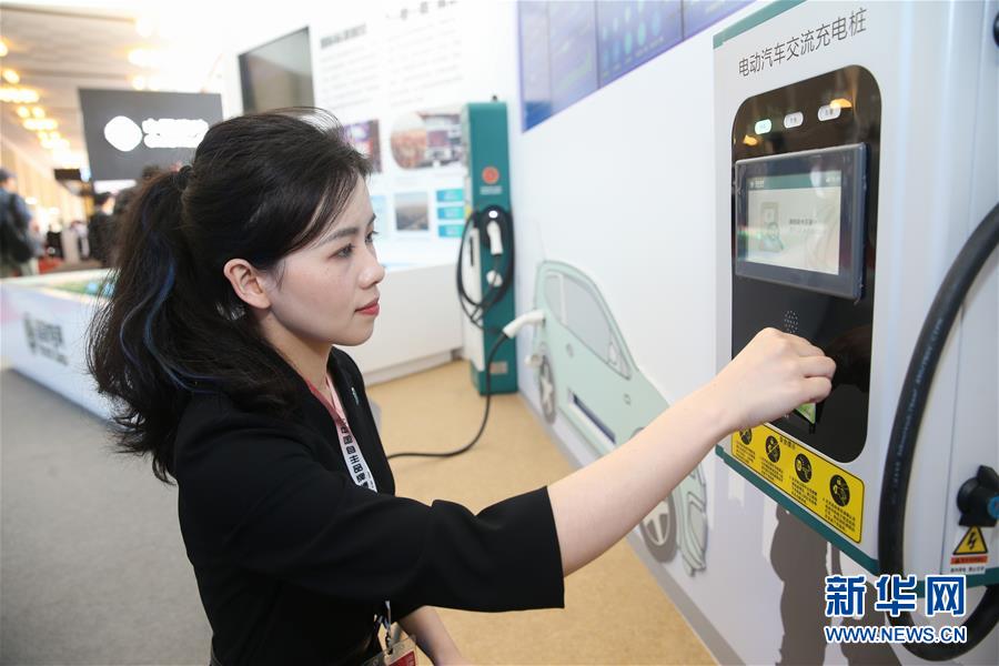工作人员在首届品博会国家电网有限公司展区演示使用电动汽车交流充电桩(5月10日摄)。新华社记者丁汀摄