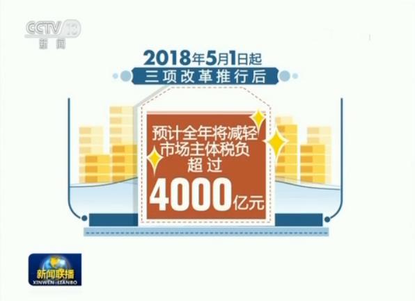 按照新政策,今年5月1日起,统一小规模纳税人标准、两档税率下调、部分企业留抵税款可退还等三项改革推行后,预计全年可减轻市场主体税负超过4000亿元。
