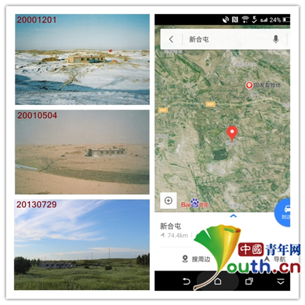从2000年到2013年,新合屯由漫天黄沙变成了天高云淡,从卫星地图上搜索新合屯,可以看到一块明显的绿色方块,那就是生态沙化草原修复区。本人供图