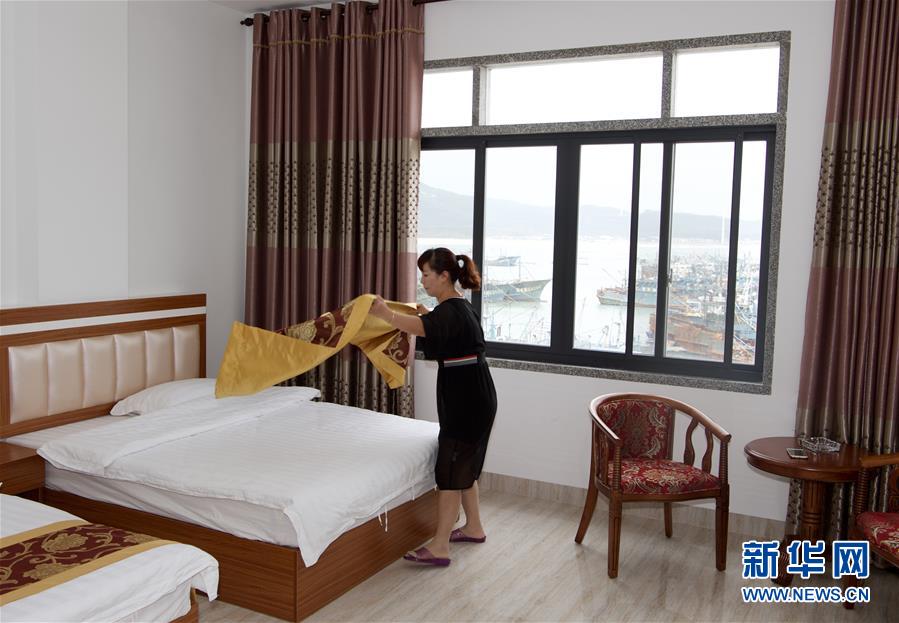 工作人员在澳角村一家海边民宿内整理房间(5月10日摄)。新华社记者 姜克红 摄