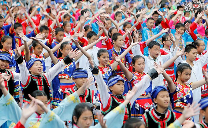在每年的采花山节上,还会看到这样一个个小身影。来自彭水苗族自治县各个学校的苗族学生们,也会在这一天盛装出席活动。