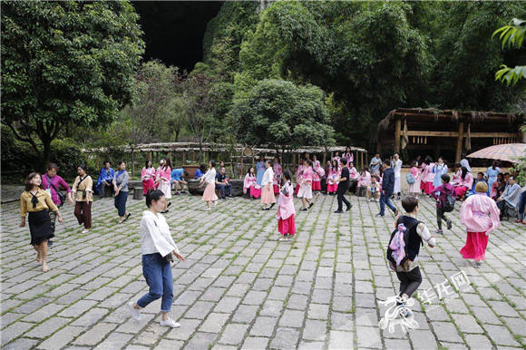 媒体记者们在桃花源景区秦村广场上跳起摆手舞。 记者 李文科摄