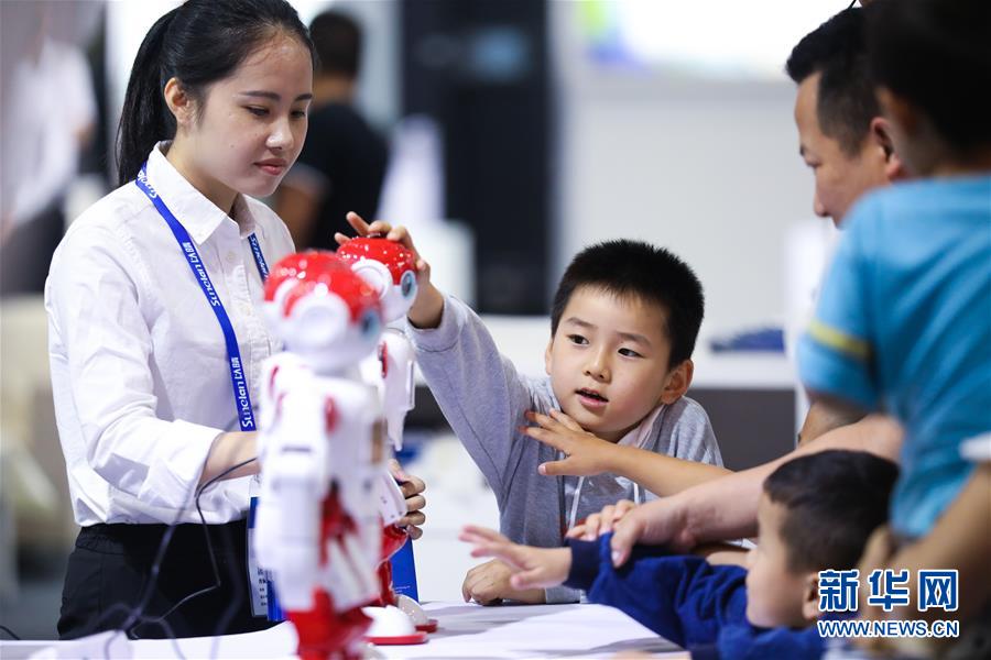 5月26日,孩子们在博览会现场参观仿真机器人。当日,2018中国国际大数据产业博览会在贵州省贵阳市开幕。 新华社记者 刘续摄