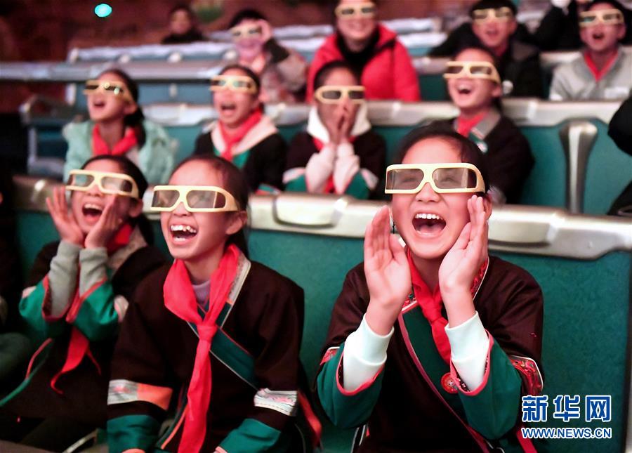 在广西柳州市景行小学柳东校区,来自三江侗族自治县和融安县大山里的留守儿童观看3D动画片(1月4日摄)。当日,柳州市举行关爱留守儿童城市圆梦活动。新华社发(黎寒池 摄)