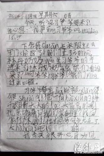 “大朋友”习近平特有孩子缘。2014年他来到福州市军门社区,和那里10多名小朋友亲切交流。活动结束后,7岁小女孩邹睿宁在日记中写道:“习爷爷太haixiu(害羞)了!”