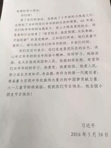 2016年“六一”前夕,浙江台州的12名小学生,以“大陈岛垦荒队员后代”的名义给习近平写了一封信。