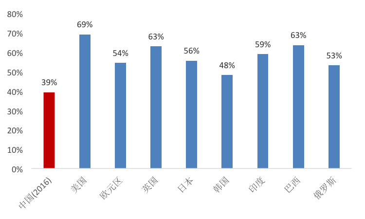 中国经济过去几十年的发展过程中,投资和出口远远快于消费增长,三驾马车增长不平衡、不协调、显然就不可持续。八十年代以来,资本形成和出口增速年均增速分别高达11.2%和15.1%,而消费增速仅为8.4%。2016年,中国家庭消费的GDP占比仅39%,不仅远低于发达国家,也明显低于许多发展中国家(图1)。这种粗放型的发展模式导致产能过剩,债务高企,环境污染,显然不能满足人们的最终消费需求和美好生活需要。向前看,我国中产阶级的崛起和年轻人较高的边际消费倾向将极大拉动消费增长。老龄化的到来将降低社会储蓄率,提高相关产品的消费需求。更重要的是对消费品的多样化和质量水平提出了更高的要求。