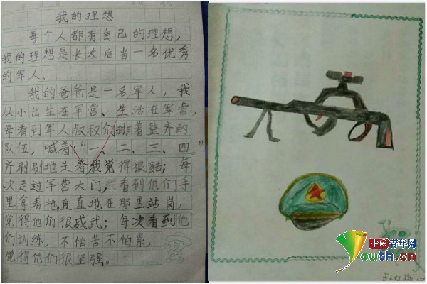 “每个人都有自己的理想,我的理想是长大后当一名优秀的军人,因为军人勇敢、顽强、智慧,能保卫国家!”在一篇题为《我的理想》的作文中,常思涵小朋友这样写道。一直以来,他都憧憬着像爸爸一样,成为一名军人。有一次,老师让画下自己喜欢的玩具,他毫不犹豫地画下了军人的钢枪。