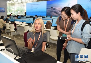 6月8日,记者在上合青岛峰会新闻中心采访。新华社记者 殷刚摄