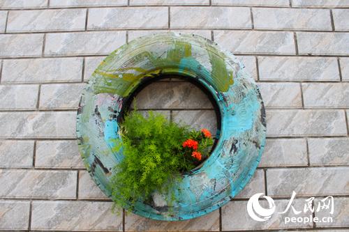 三沙市永兴环保中心内墙上挂满轮胎做的盆栽。人民网记者 刘云摄