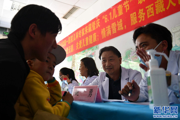 北京大学第一医院儿科专家张清友在给西藏患儿诊治。(6月9日摄)