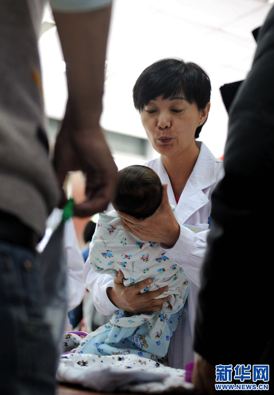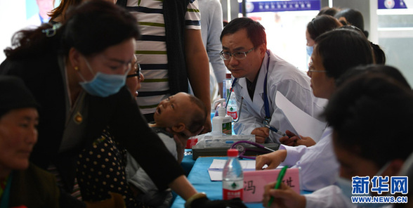 北京大学第一医院儿科专家侯新琳在给西藏患儿诊治。(6月9日摄)