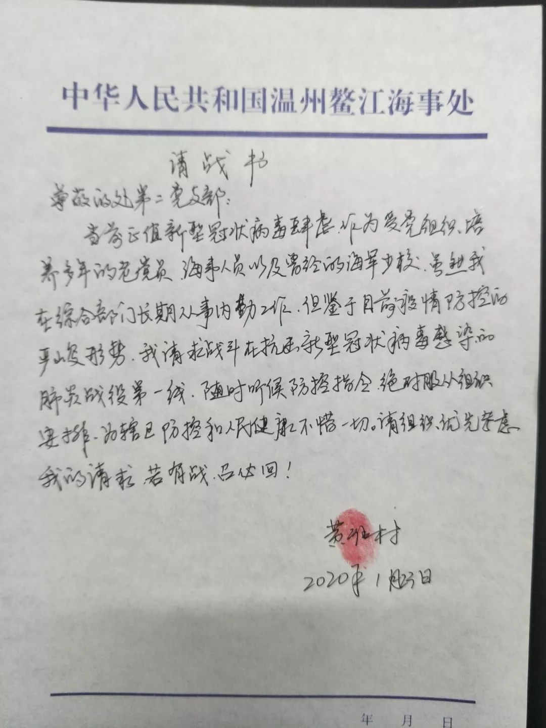 这封按着红手印的请战书,来自温州鳌江海事处第二党支部黄准村同志,一位党龄接近30年的老党员、曾经的海军航空兵少校。