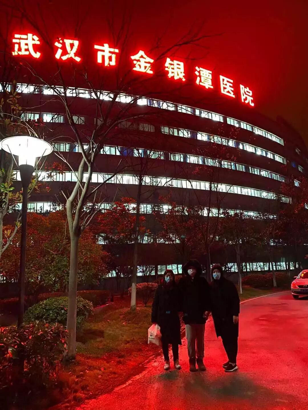 凌晨2点多,从医院返回住处时,三位曙光医院医务人员在金银潭医院门前合影