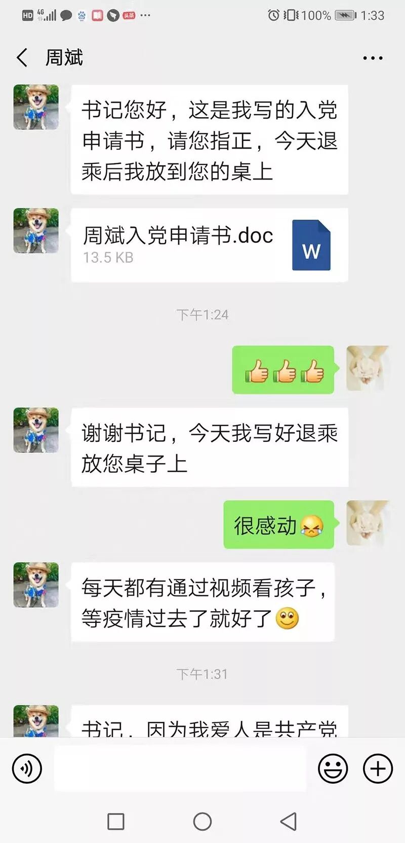 “我是一名铁路客运工作者,我将在这个岗位上努力奋斗,积极向党组织靠拢,希望党组织能够接纳我。我承诺将带领班组全力以赴抗击疫情……”2月1日,一份入党申请书出现在动车一队党总支书记的桌子上。