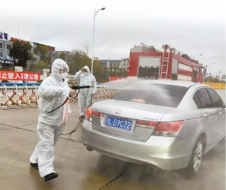 近日,湖北省消防救援总队咸宁支队通城大队防疫突击队在高速公路收费站对车辆进行洗消。李诺成 摄