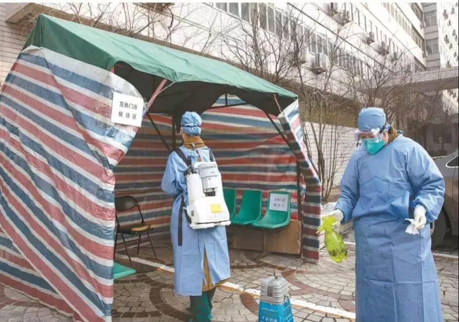 2月11日,应急总医院发热门诊医护人员对候诊区进行消杀。疫情发生后,应急总医院积极行动,全力以赴救治患者,发热门诊是疫情防控的 “前哨” 。记者 张洁 摄