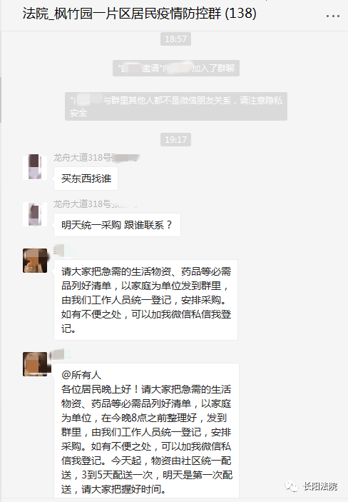 随着社区防疫工作的推进,居民外出购药,采买生活物资成为一大难题,为减少人员流动,保障防疫居民正常生活,长阳法院社区疫情防控队配合社区工作人员,建起微信群,逐户收集人员物资采购信息。