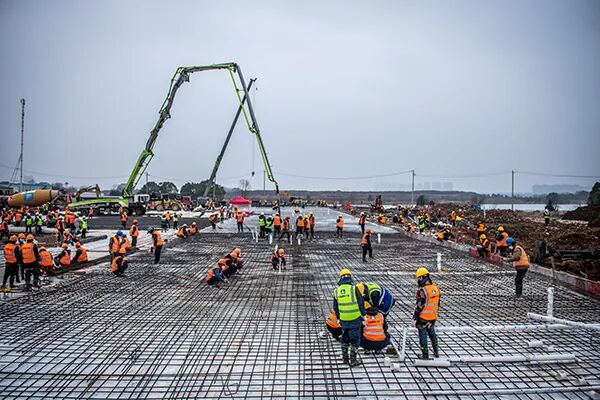 火神山医院共有12000多名工人参与建设,图为近400名工人对火神山1号住院楼底板进行钢筋绑扎和浇筑穿插施工。